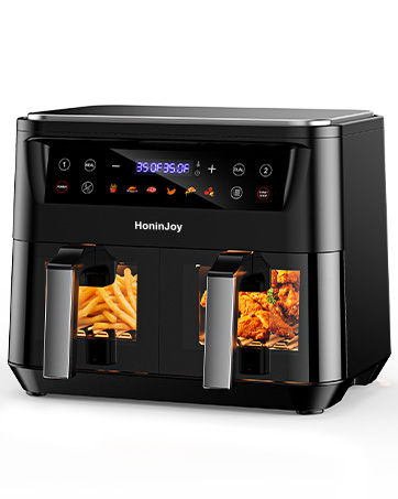 【Total 12QT Family Feast Capacity】: HoninJoy air fryer designed for modern families. With the full basket large enough to prepare a complete meal for 6-8 people at once. The generous space accommodates a whole chicken, 30 chicken wings, a 9-inch pizza, or 1000g of fries, turning family dinners and parties from a chore into a delight