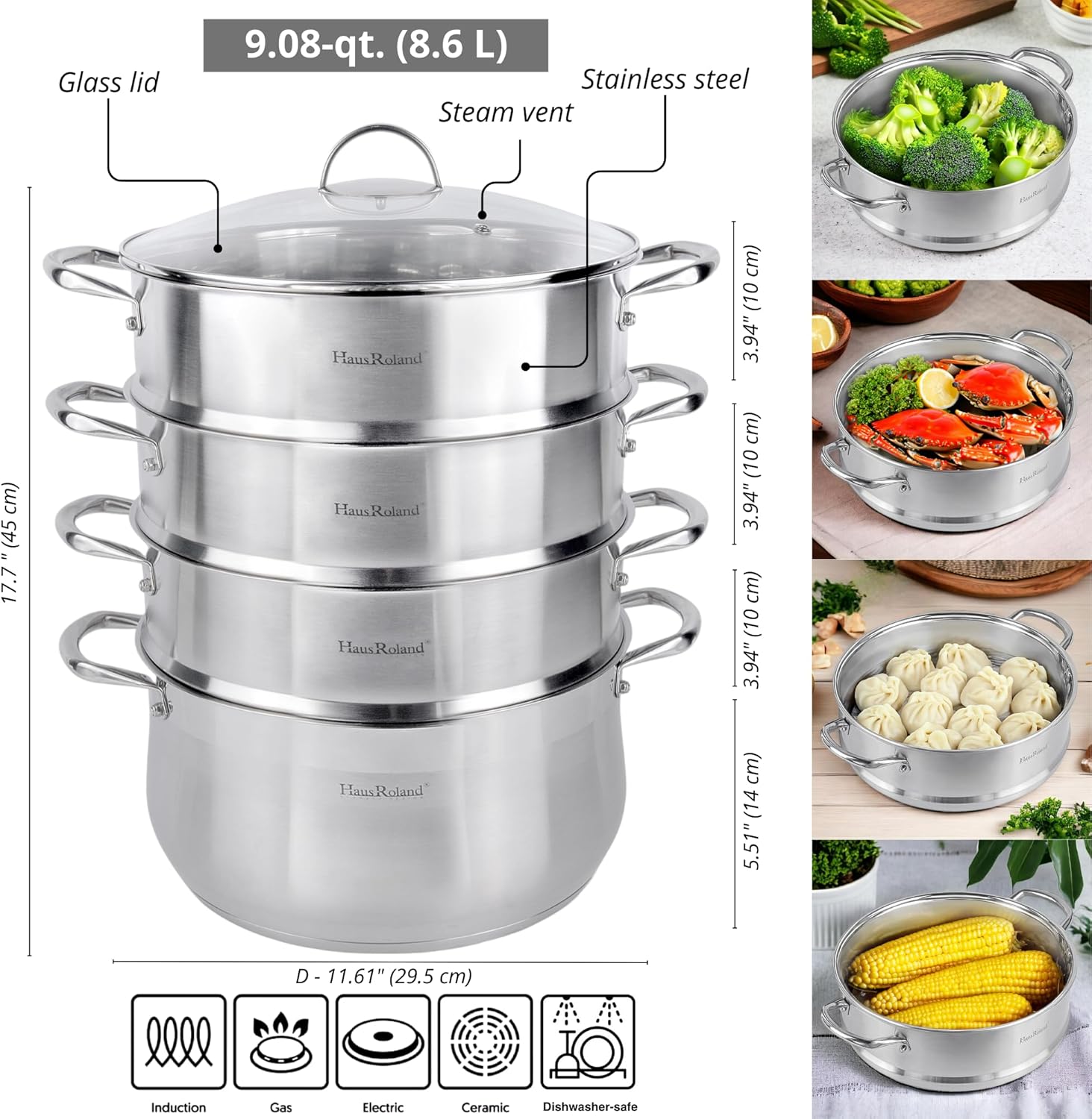 3-Tier Stainless Steel Steamer Pot with Lid Dumpling Steamer Pot for Cooking (3-tiered), Multi-Layer Cookware Pot, Food Vegetable Cooking Pan with Stackable Pan Insert for Vegetable, Dumpling, Meat, Dishwasher safe, Induction Safe (Silver, 9.08-qt. (8.6 L